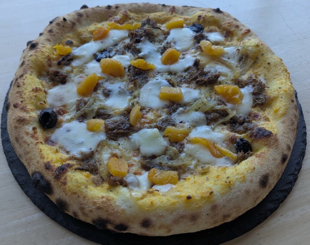 Crème fraîche, mozzarella, poivrons grillés, poulet de la boucherie Rhul mariné au curry et raisins, oignons frits, olives, origan