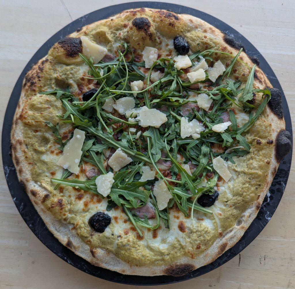 Crème fraîche, mozzarella, poivrons grillés, poulet de la boucherie Rhul mariné au curry et raisins, oignons frits, olives, origan