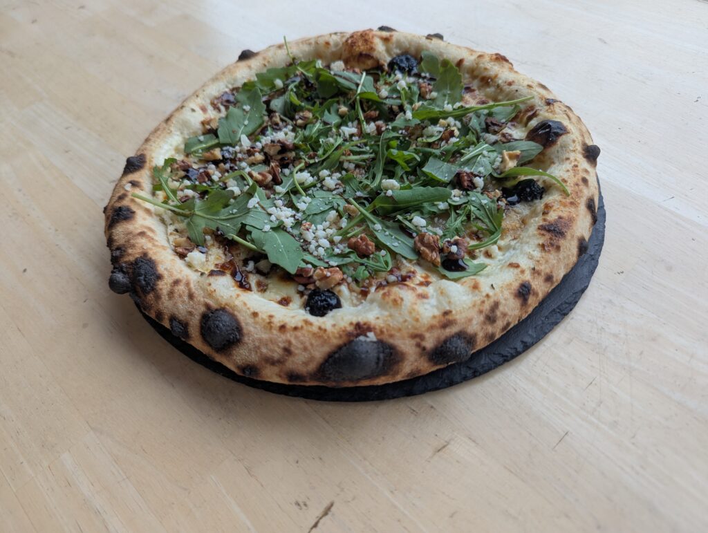 Crème fraîche, mozzarella, fromage de chèvre, pignons de pin, miel, olives, origan