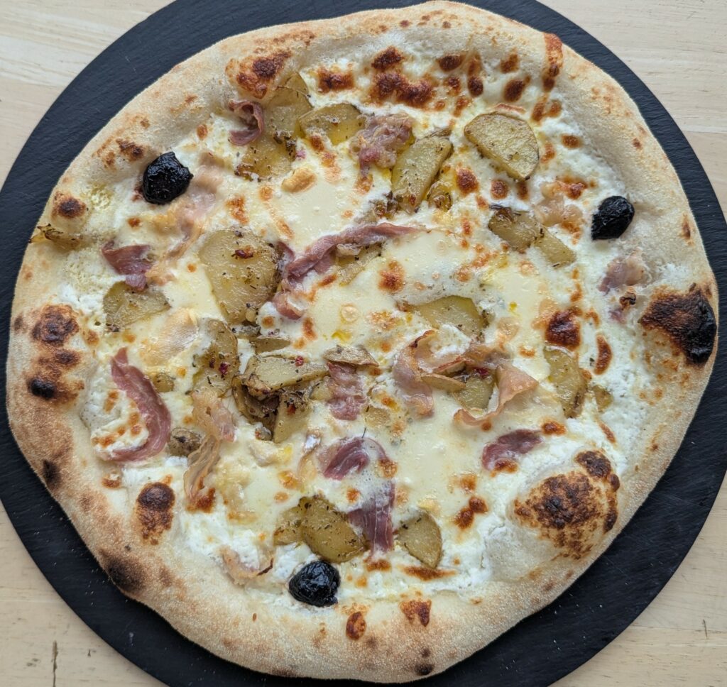 Crème fraîche, mozzarella, pommes de terre, morbier AOP, tranches de magret de canard fumé, oignons confits, olives, origan